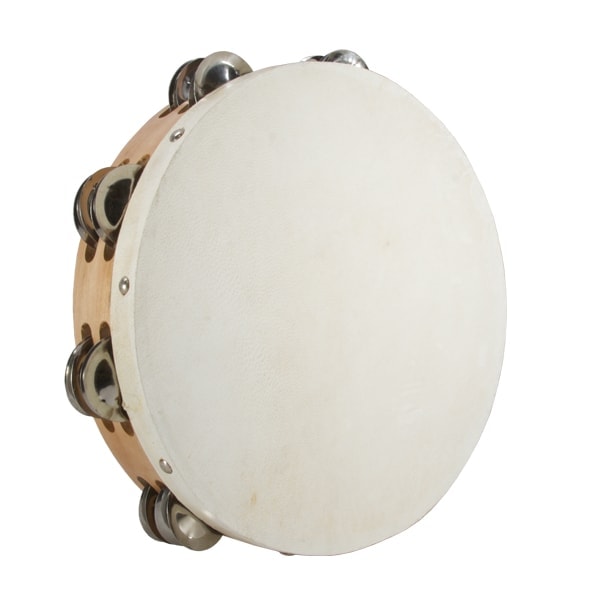 10″ Tambourine made of solid hardwood and real leather heads. Double Row of Jingles